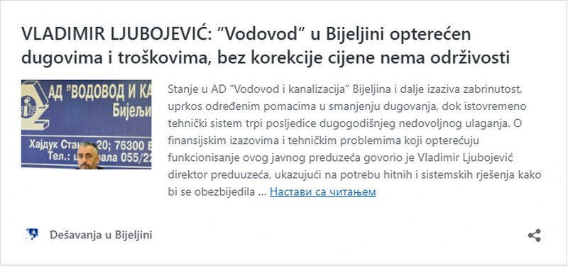“Минимална плата је готово удвостручена, цијене енергије и материјала вишеструко су порасле, а цијена воде је остала иста више од 15 година. У таквим условима ниједно предузеће не може нормално функционисати“, рекао је.